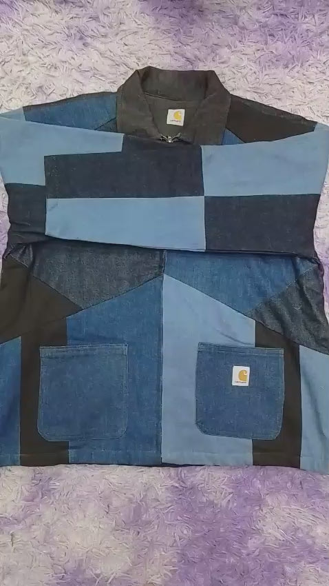 CR 1441 Stand out with this upcycled patchwork denim jacket, crafted from carefully selected denim panels in multiple blue tones. Designed with a bold geometric layout, this piece blends classic workwear durability with a modern streetwear edge.